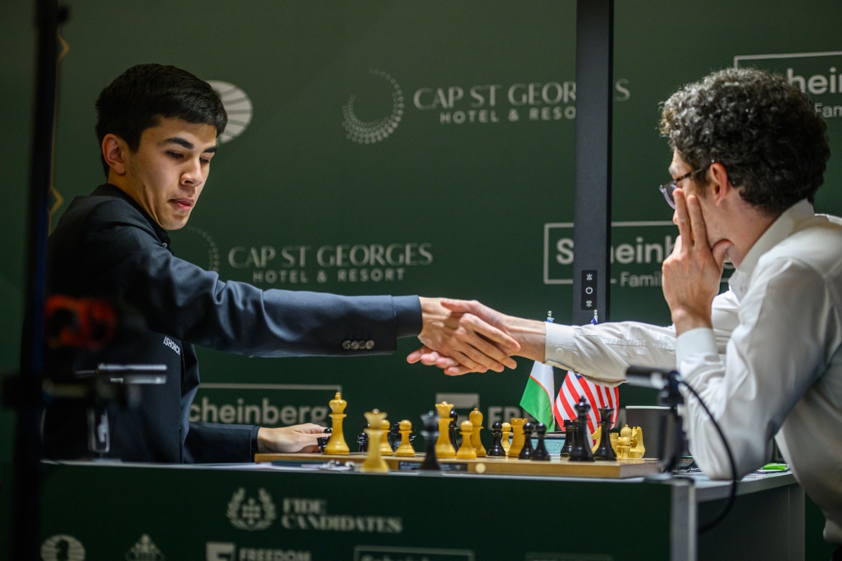 Sindarov shakes Caruana's hand after their Round 4 clash. Photo: FIDE